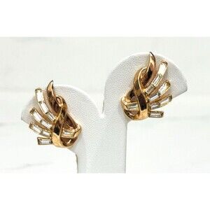 Beautiful vintage Trifari clip-on earrings designed by Alfred Philippe, confirmed via patent Des. 170,284 (1953), which matches this design (please see 5th photo). Features gold tone metal with arched fan-like swirls and channel-set clear baguette rhinestones.