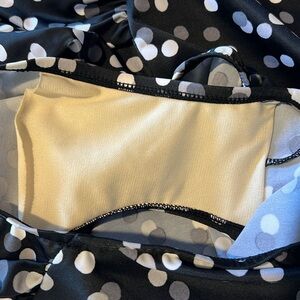In good condition, super cute polka dot style with V neck and rouching for slimmer look. See images for measurements and wear. Who is going to love it and take it on their next vacation.