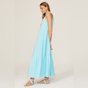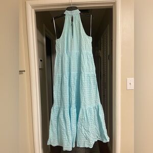 Trina Turk Tiered Sunglasses Maxi Dress Size M Aqua Blue cotton (100% Cotton). Maxi. Halter neck. Sleeveless. Back keyhole and hook closure. Discolored on neckline and inside bodice. See pics. (Did not attempt to clean)
