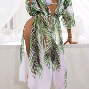 Embrace the summer vibes with this stunning tropical leaf print swim cover-up. Perfect for beach days, this green and white design adds a touch of elegance to your swimwear collection.
