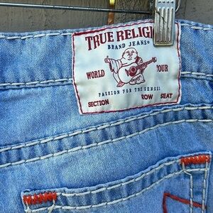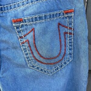 True Religion Ricky Relaxed Straight Jeans Sz 32 With Orange Stitching.