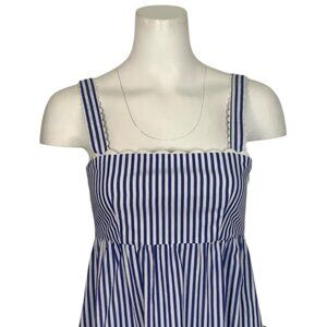 This Tuckernuck Georgia Dress makes a statement due to it's sleeveless A-line silhouette, adjustable straps, side zipper with hook/eye, maxi hem, scallop trim, pockets, smocked back, empire waist, square neckline and blue/white striped design.