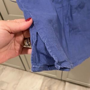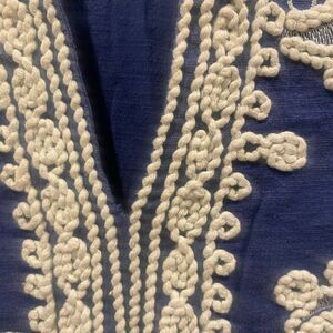 Beautiful Theme tunic top or could be a swimsuit cover up or dress with sandals. It is gently used. Such a beautiful piece! Blue in color with white details.