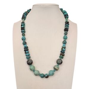 Handcrafted vintage round and rondelle Chinese turquoise bead necklace with sterling silver hook clasp. 18" length