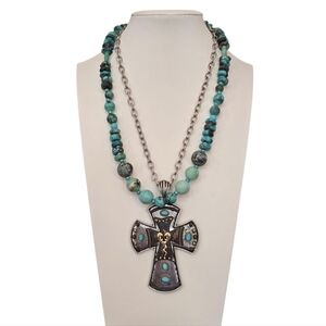 Turquoise Bead Necklace Silvertone Metal Cross Necklace 2 Piece Bundle