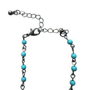 Elegant faux turquoise beaded necklace featuring a cross pendant with pearl, crystal and anther small cross charm. Perfect for adding a touch of color to any outfit.