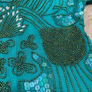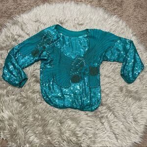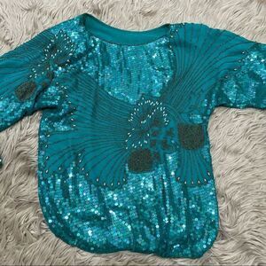 Sparkly sequin turquoise blouse. Gorgeous detail and beading. No interior tags, so please see measurements for sizing details. When I tried it on I believe it fits like a small.