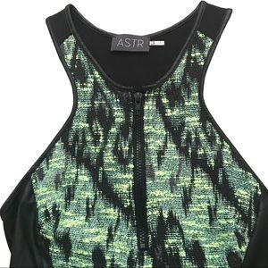 Neon green dress with snake-pattern tweed. Scuba inspired zip closure at front. Hidden side zip closure. Unlined. 58%acrylic / 24% poly / 18% cotton. Size small 32"L