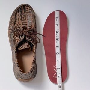 Twisted Moccasins boat Shoes,leather, laces-up,very unique letters printed details,soft and flexible leather, removable sole, slip resistant outsole, moisture-wicking. Great preowned condition, minor scratches,marks, signs of wear.