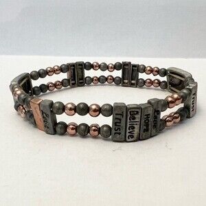 Vintage Bundle of Two Inspirational Mixed Metal Beaded Elastic Bracelets. Love bracelet features large silver tone beads with "Love" and a heart surrounded by accent beads in gunmetal and copper saying love, hope, believe, and trust. Second bracelet features antiqued silver tone spacer beads with rhinestone detail and bronze word beads which say believe, wish, respect, imagine, inspire, love, and create. Both bracelets have an antiqued burnished finish, adding to their charm. Both are strung on sturdy elastic and measure 7" round unstretched. Good vintage condition. No flaws.