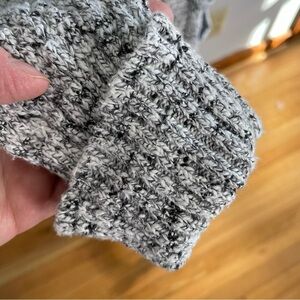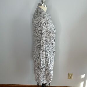 Such a perfect staple for your wardrobe! Mix of black and white knit. Long sleeves. Cuffs and collar are ribbed. Some stretch. Two large front pockets. It’s an open knit so it is see through. Perfect for work! Super cozy. Missing fabric tag. Throw on and run out the door!