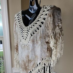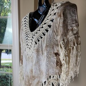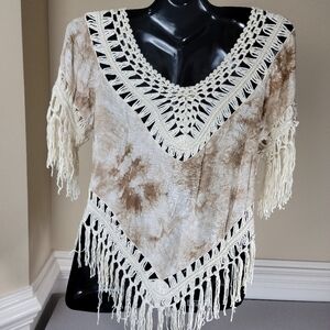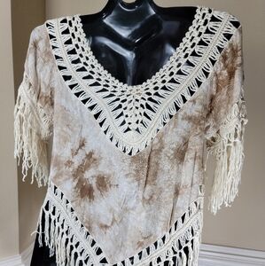Tye-dye fringed top features crochet collar, crochet and fringe accents on short sleeves and handkerchief hem, polyester/acrylic, ONE SIZE, (26" from shoulder to hem, 21" arm pit to arm pit) NWOT, never worn/used FABULOUS