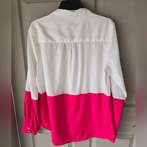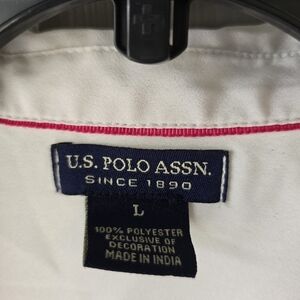 This U.S. Polo Assn women's shirt is a size L with a white and pink colorblock design. It features a collared neckline, button closure, and long sleeves with a classic/fitted sleeve type. Made of polyester, this blouse has a solid pattern and a woven fabric type. The shirt has a classic fit and is suitable for various occasions such as travel, parties, workwear, and casual outings. It is a versatile piece that can be worn in all seasons due to its breathable material.