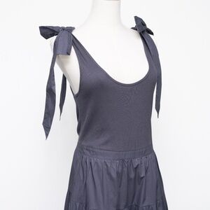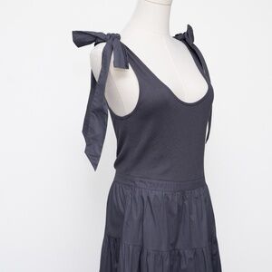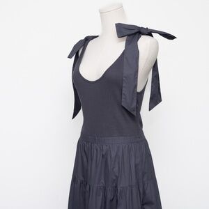 Ulla Johnson Hope Dress in Periscope — a soft, lightweight tank dress that’s perfect for warm summer days or casual evenings out. Crafted in a unique ribbed knit and cotton poplin combo, it features a fitted bodice that flows into a tiered skirt for an effortless, feminine shape. Wide shoulder ties bow into an adorable detail, adding charm to the easy silhouette. Side seam pockets provide a practical touch, while the breathable 100% cotton fabric keeps it comfortable and airy.
