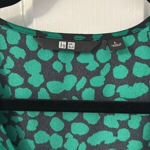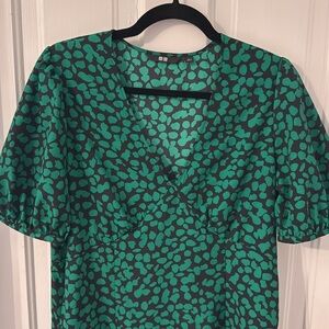 This Uniqlo sundress features a vibrant green dots on a black background pattern, perfect for casual or work settings. The short puff sleeves and V-neckline add a touch of elegance, while the mini length and flared silhouette offer a playful and contemporary style. Two hidden pockets and hidden side zipper.