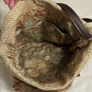 This unique handmade purse is fashioned from fabric remnants. There is a hidden magnetic closure to secure the bag, and the interior is very roomy. There are 2 slip pockets on the back wall of the purse. Measures approximately 13” across and 13-1/2” high. Drop on straps is approximately 12”.