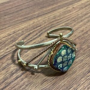 Unique vintage gold & silver tone cuff bracelet with substantial center stone painted in metallic green and gold in a twisted rope setting.