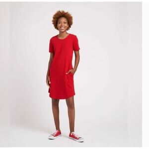 Universal Standard Halie red t-shirt dress. An easy-to-wear tee dress that's your throw-on-and-go essential. Relaxed fit made from our premium Peruvian cotton that's ultra soft and ultra comfortable. With a curved hi-low hem and classic crew neck, this dress is an effortless piece that's still perfectly polished.