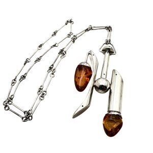 Unique vintage modernist necklace featuring two bugs encased in amber, set in sterling silver. A striking accessory that combines natural beauty with artistic design, perfect for jewelry enthusiasts and collectors.