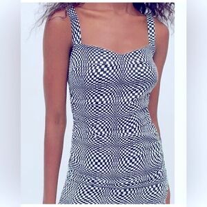 Ruched mini dress from Urban Outfitters built in a bodycon fit with an allover print. Topped with thick, adjustable shoulder straps at the straight neckline.