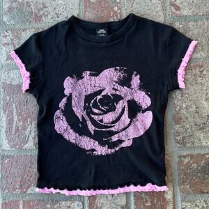 Urban Outfitters Cropped Rose Tee Shirt Black Pink Lettuce Trim Layered Size XS