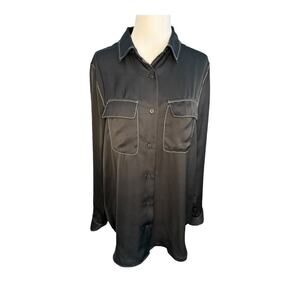 Urban Outfitters Women's Small Black Button-Up Blouse White Stitching Satin Feel