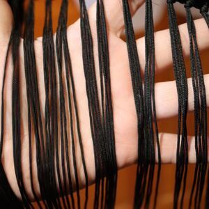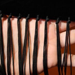 Style: Black long wrap scarf, fringe detail, elegant evening accessory