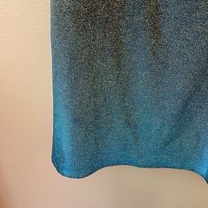 Blue polyester (85% Polyester, 15% Lurex). Sheath. Cowl neckline. Sleeveless. Partially lined. 38" from shoulder to hemline