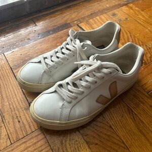 VEJA T2 CAMPO WHITE LEATHER LACE UP LOW TOP CASUAL SNEAKER Sz 6 Gold