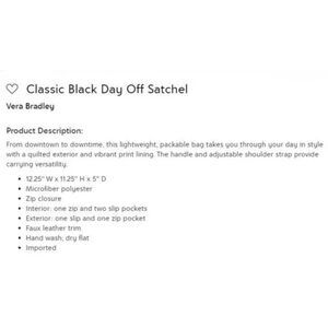 VERA BRADLEY DAY OFF SATCHEL SHOULDER BAG CLASSIC BLACK SIGNATURE RETIRED NWOT