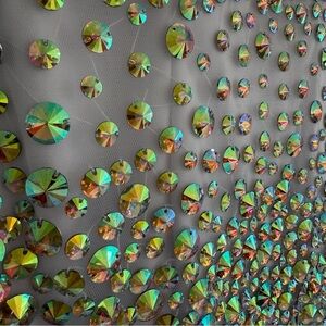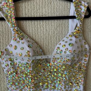 Feature zip back closure and padded bust. Gently used condition, the inside shows signs of previous wear and could be professionally spot cleaned. There is a small area with 1-2 missing beads on front left shoulder strap as highlighted in photo.