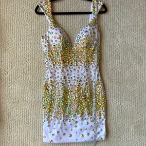 VIENNA White Iridescent Beaded Evening Cocktail Formal Mini Party Dress …
