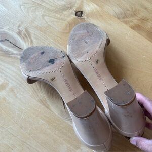 Womens size 12M, neutral beige, strappy, block heel, leather upper, lining and outsole, open toe, ankle strap with adjustable buckle closure, lightly cushioned footbed.
