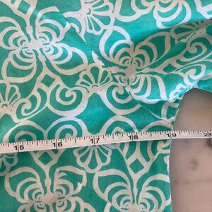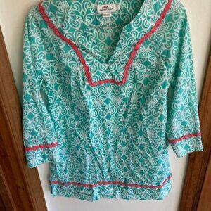 VINEYARD VINES Tunic Dress Geo Torquoise Print Coral Trim V Neck Long Sleeve S