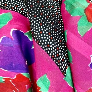 Bold and colorful floral pattern - royal purple and bright red flowers, jungle green leaves on a magenta pink backdrop - at the center is a square of black with the tiniest red and white polka dots- GORGEOUS!