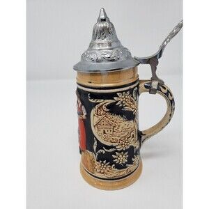 Vintage German Marzi & Remy POTTERY small collectible beer stein. Beer Brewery Travel Europe Germany memorabilia souvenir. Pottery STEIN with silver colored decorated metal lid. Colors still bright and vibrant. Main scene depicts lumberjacks enjoying beers in a pub while flirting with the waitress.