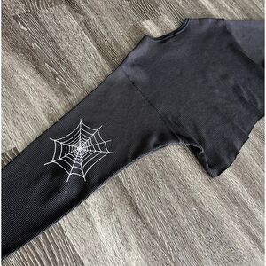 Y2K top, grunge aesthetic, goth fashion, punk thermal, skull shirt, spiderweb print, black waffle knit, emo outfit, reworked vintage, alt style, spooky cute, 2000s style, Halloween streetwear, cyber goth, Depop style