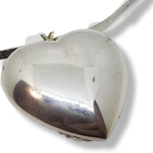 Gorgeous vintage necklace with large silverplated puffed heart pendant detailed with glass rhinestones on a thick silver plated herringbone style chain. Necklace chain measures 18-1/2 inches in length and 1/4 inch wide. Pendant measures 2 inches tall and 2 inches wide. Great condition.