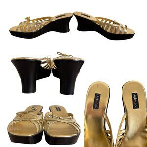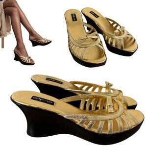 VINTAGE Y2K 2000'S GOLD BOW STRAPPY WEDGE PLATFORM SANDALS SIZE 7 NEW