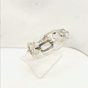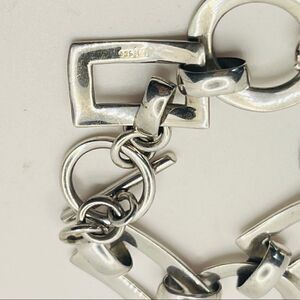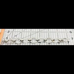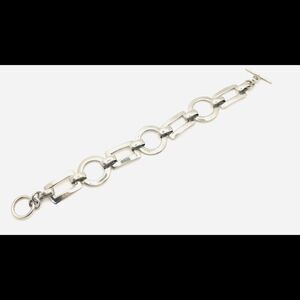 This contemporary chic silver open paneled link bracelet with rectangles and circles will be a standout item in your wardrobe. It is stamped 925 and is 7 1/4 inches in length. It has a toggle clasp that is easy to use. Its color is slightly on the matte silver shade, but will stand out against any color of clothing. Its design is open rectangles and circle panels linked together. It is a distinctive piece of jewelry.