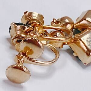 Features: Screw-back closures; prong-set rhinestones; geometric drop design; vivid emerald-green square-cut and round-cut faceted stones; classic mid-century cocktail style