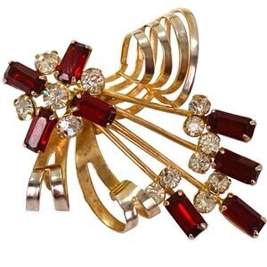 VTG 1940s Retro Moderne Gold Tone Ruby Red Rhinestone Ribbon Spray Brooch Iconic