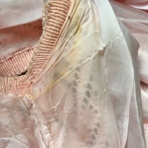 Women’s 1950’s vintage apricot-beige wool sequin beaded knit top. The sleeveless top has a high neckline and a diamond pattern created by the knit and beadwork. Small, round sequins and beads embellish the top, catching the light and adding texture. The bottom hem features a fringe of beads, and the garment is paired with bright orange bottoms, creating a contrast in color and style. Condition: In good condition with most sequins and beads in tact. There are some missing beads and sequins, loose stitching, and stain on silk lining due to wear. Well loved!!!!