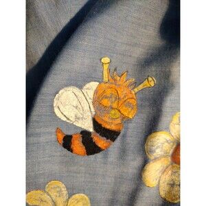 This product is a vintage 1970s artsy hand-painted button-down top featuring eyelet lace trim, dagger collar, button down pockets, and whimsical frog, turtle, ladybug, worm, mushrooms, and a bee motif. The shirt is made from a comfortable cotton blend material in a beautiful blue color, giving off a artsy boho hippy look. With its unique style and charming details, this top is perfect for women who appreciate retro fashion and want to make a statement with their outfit. Size is marked 20 can fit a modern small or medium