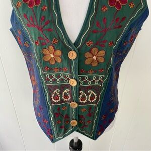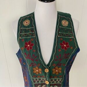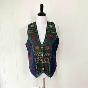 VTG 80s 90s Solutions Green Blue Floral Embroidered Vest Size Large Boho Grunge