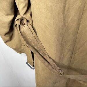 This vintage Faux Suede deep tan trench coat circa 1990s is in remarkable condition and looks as if it was barely worn (if at all). No signs of wear or damage detected and even the back vent slit has manufacturer’s stitch still in place.