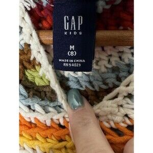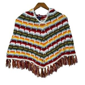 VTG Gap Kids Rainbow Hooded Poncho Fringe 90's Cotton Crochet Sz M/8 in very good condition! Stain in the front, please see photos, one tiny pull.