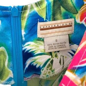 Bring vacation vibes anywhere you go with this Expressions Women's Hawaiian Honi Sarong Dress. Crafted from lightweight 100% rayon, it features a vibrant tropical floral print with hibiscus, palm leaves, and ocean blues. The scoop neckline, sleeveless cut, and sarong-inspired waist tie create a flattering and breezy silhouette perfect for summer days, beach getaways, or poolside lounging.