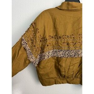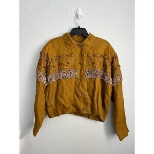 VTG Linen Beaded Cropped Oversized Jacket Mustard ButtonUp Cowgirl Boho Western