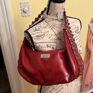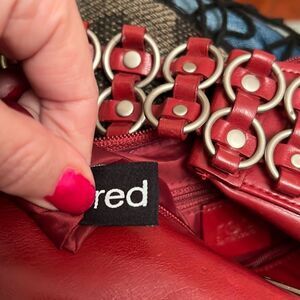 This back ROCKS - feels like leather but it’s 100 PVC with heavy wide straps with silver ring detail! Spacious rocker style bag!
